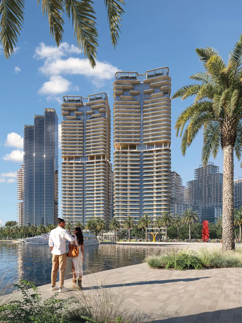 Les lignes architecturales sculpturales, les jeux de lumière et de transparence, ainsi que les volumes parfaitement maîtrisés créent un équilibre subtil entre esthétique et fonctionnalité. Les résidences offrent des espaces de vie ouverts, baignés de lumière naturelle, avec des vues spectaculaires sur le canal, la skyline de Dubaï et le Burj Khalifa.